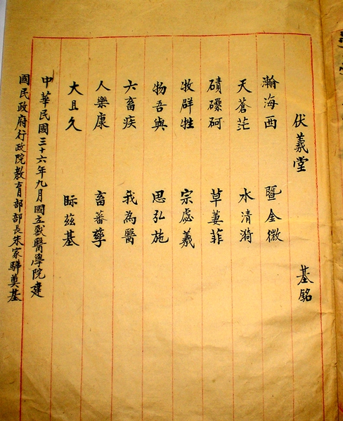 盛彤笙还亲自撰写了一篇铭文《伏羲堂记》,以志建堂之艰难。“中华民国卅五年秋,国民政府以西北畜牧生产事业,有待于兽医科学者綦夥,乃于兰州创立兽医学院。俾兼此重任,国步方艰,疮痍未复,库帑弥绌,学院樽节常支,积累数月,甫能就皋兰西郊,市地为院址,复数月,方克略鸠工与材,作此一堂,为永久院舍。伏羲者,传说中吾国畜牧兽医之祖,故名堂曰“伏羲”,用追前烈。建筑之间,厄於度支,竭蹶者屡。堂成日,谨溯经营始末,刊石以示来兹,庶知创业艰难,乃朝乾而夕惕,思所以报国之厚惠焉尔。