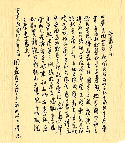盛彤笙还亲自撰写了一篇铭文《伏羲堂记》,以志建堂之艰难。“中华民国卅五年秋,国民政府以西北畜牧生产事业,有待于兽医科学者綦夥,乃于兰州创立兽医学院。俾兼此重任,国步方艰,疮痍未复,库帑弥绌,学院樽节常支,积累数月,甫能就皋兰西郊,市地为院址,复数月,方克略鸠工与材,作此一堂,为永久院舍。伏羲者,传说中吾国畜牧兽医之祖,故名堂曰“伏羲”,用追前烈。建筑之间,厄於度支,竭蹶者屡。堂成日,谨溯经营始末,刊石以示来兹,庶知创业艰难,乃朝乾而夕惕,思所以报国之厚惠焉尔。